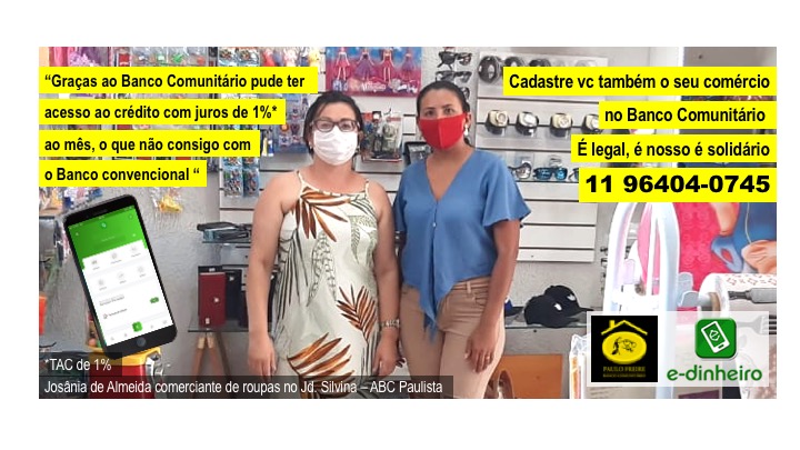 É um sistema digital de pagamento, depósito e transferência que pode ser usado por empresas, trabalhadores e aposentados. Do comerciante é cobrada uma baixíssima taxa de 2%, sendo que 1% fica para a estrutura da plataforma e o outro 1% vai pro Banco Comunitário, que pode realizar créditos e microcréditos que movimentam a economia local e melhoram a renda e a qualidade de vida nos bairros. Portanto, quanto mais se usa o e-dinheiro, mais os Bancos Comunitários podem beneficiar o território. A circulação do e-dinheiro beneficia o comércio, fortalece a economia local e pode criar novos postos de trabalho.