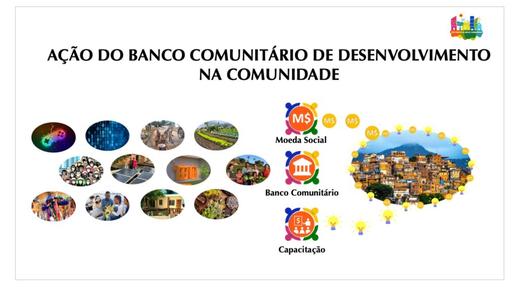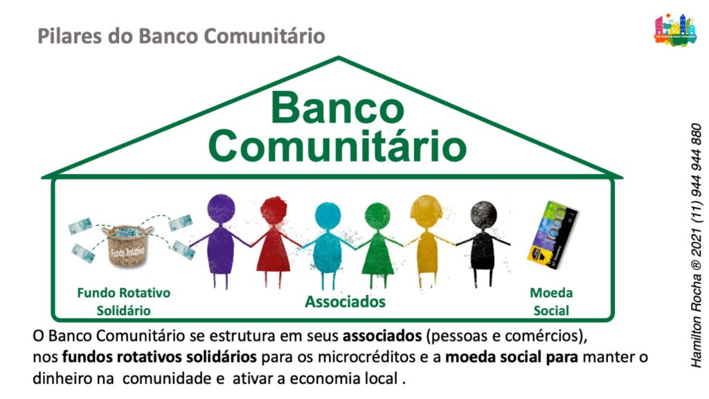 O Banco Comunitário tem uma moeda social própria. É um sistema aonde a moeda não sai do bairro. É como um clube, aonde participam moradores comércios, produtos e serviços locais. Quanto mais se usa a moeda social, mais fortalece a confiança, a autoestima e a economia local. Os moradores investem no bairro, compram no bairro e isso gera mais confiança, mais renda e mais emprego local. A roda gira, e o dinheiro fica no bairro.