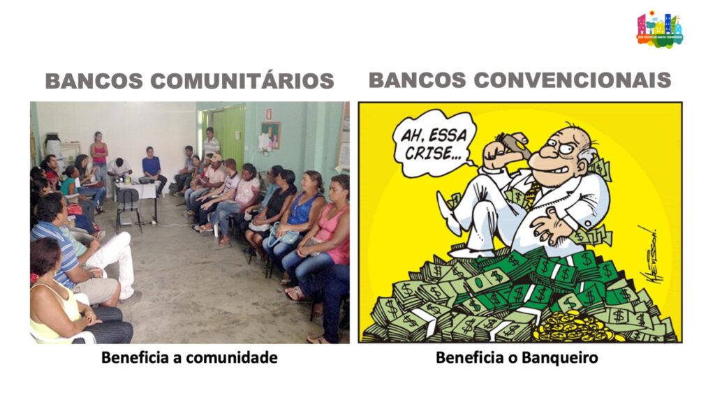 A grande diferença entre os Bancos Comunitários e os Bancos Convencionais ou Fintechs é que os Comunitários não têm como objetivo o lucro. Todo o ganho é reinvestido na própria comunidade. Isso muda radicalmente o destino do dinheiro na Comunidade.