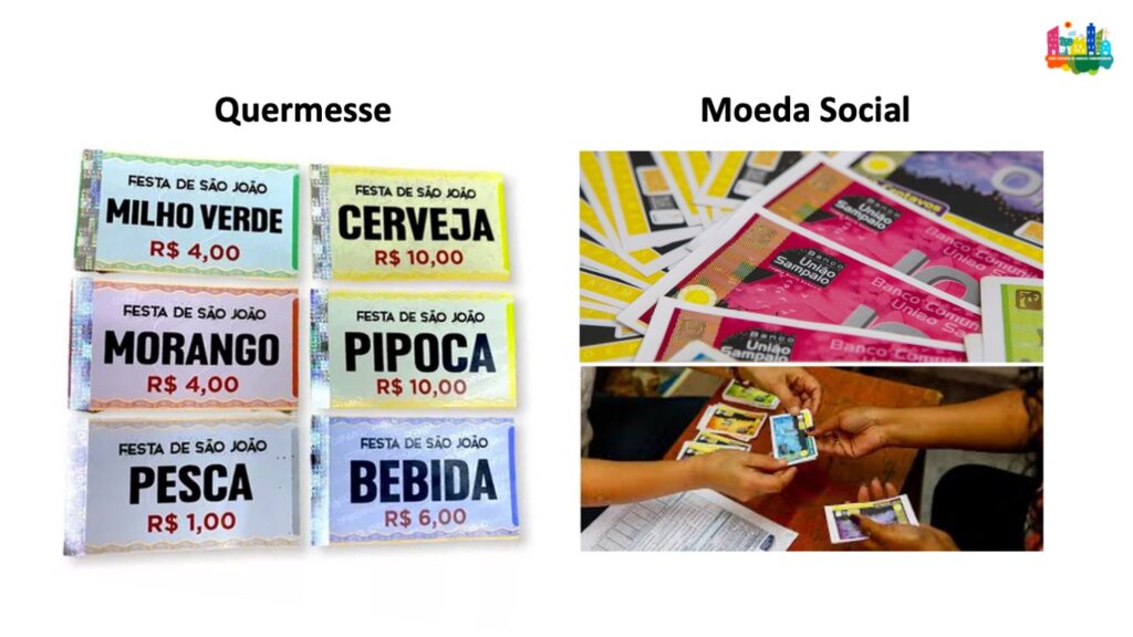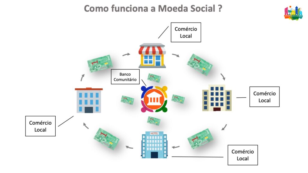 As Moedas Sociais funcionam como uma quermesse, onde para se comprar é necessário adquirir a moeda local (que, sempre, vale o mesmo que o real). A diferença é que a compra com a moeda social fortalece o comercio e consequentemente a economia local, gerando mais trabalho local, mais empreendimentos, melhor qualidade de vida das pessoas e mais renda local. Quanto mais pessoas compram com a moeda social, mais o dinheiro fica na comunidade e todos se beneficiam. No Brasil, o Banco Central autoriza a emissão de moedas sociais, desde que sejam emitidas por bancos comunitários e não visem o lucro, mas o benefício da comunidade.