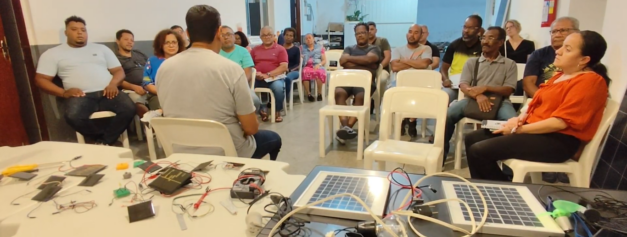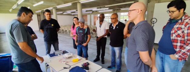 alunos já se mobilizam para criar uma associação ou cooperativa de energia solidária O campus Cotia do Instituto Federal ainda está em implantação, mas recebeu o curso de noções básicas de energia fotovoltaica. Os alunos puderam aprender, na prática, como é o esquema de montagem do sistema e ver uma pequena placa solar gerando energia elétrica. Esse foi o último dia do curso de extensão sobre energia solar solidária em Cotia, que teve aulas online e presenciais. Muitos dos alunos chegaram com a ideia de instalar um sistema individual, mas Walmeran Trindade Júnior, professor de engenharia elétrica do Instituto Federal da Paraíba, convenceu a maioria dos alunos que implantar um sistema coletivo de geração de eletricidade é mais viável, solidário e barateia o custo. A consultora de sistema Larissa Silva admite que chegou no curso “com uma visão pequena de suprir a própria necessidade de energia e no máximo expandir…